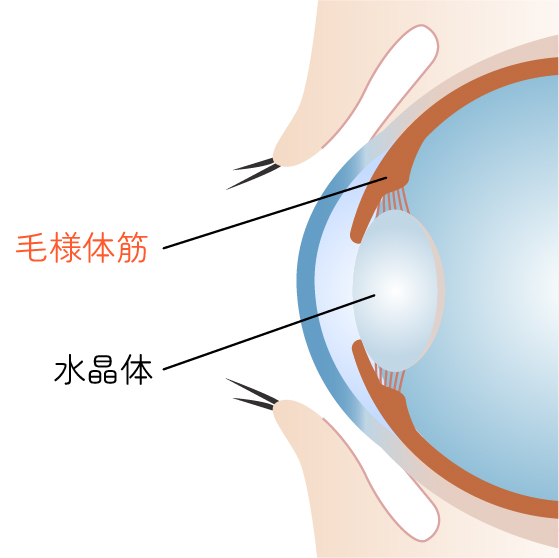 眼球内にある水晶体というレンズの周りには、ピント調節筋と呼ばれる毛様体筋という筋肉があります。これらの筋肉はパソコンやスマートフォンの画面を凝視したり、仕事や家事、勉強などで眼を酷使していると凝り固まってしまうため、気がつかないうちに視界を狭めたり、眼精疲労の原因になったりします。
